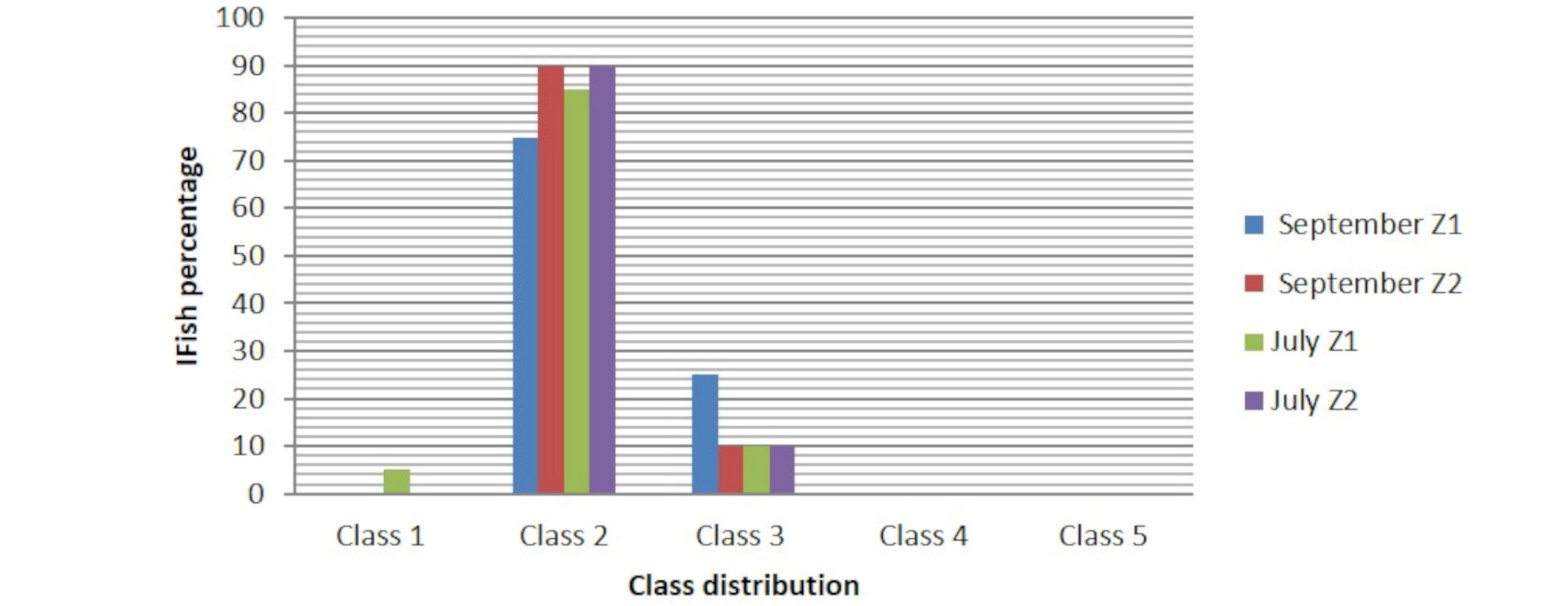 IFish values had a very significant correlation with IGP (P = 0.0001). In September, the average IFish scores increased, reaching 140.75 in Z1 and 124.31 in Z2 showing a significant difference (P = 0.0094). Most of the fish were categorized in class II (75% in Z1 and 90% in Z2), while class III individuals were more frequent in Z1 (25%) than in Z2 (10%). In July, the trend revealed a relative homogeneity; yet the indices were generally lower, corresponding to 111.89 for Z1 and 114.73 for Z2, with no significant difference (P = 0.5074). The distribution of classes indicated a dominance of class II, which constituted 85% of the fish in Z1 and 90% in Z2, closely followed by class III (10% for both zones) and a few specimens in class I (5%, exclusively in Z1). Comparing the two zones, there was a significant difference in Z1 (P = 0.0012) compared with Z2 (P = 0.0482, significant limit). In terms of quality, the best fish were those from Z1 in July, but they only represented a small proportion (5%). They were followed by those from Z2 during both periods, then by those from zone Z1 in July, and finally in September.