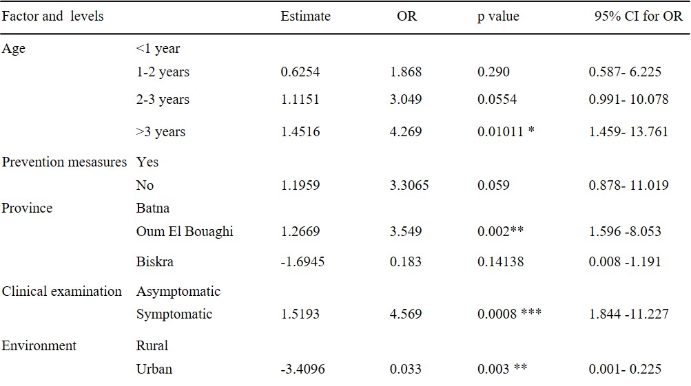 That means all these variables are a definitive predictors of L. infantum infection in exposed dogs according to our results. Results of the analysis are summarized (Table V and VI).