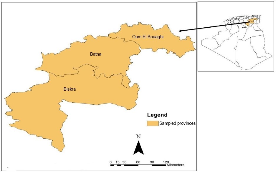 Figure. 1. Geographical location of provinces sampled (Batna; Oum El Bouaghi, and Biskra).
