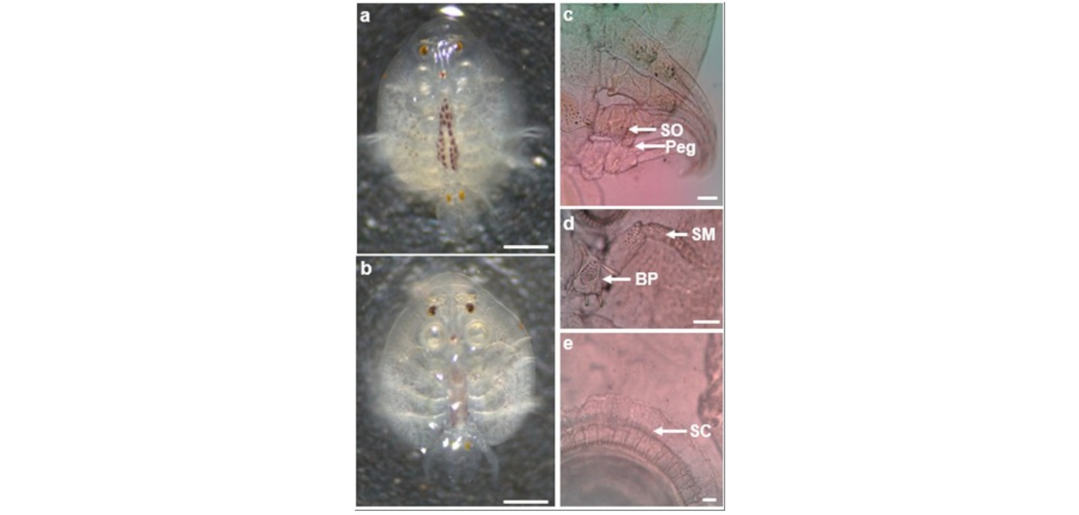 Figure. 1. <em>Argulus</em> <em>foliaceus</em> male. a. Dorsal view, b. Ventral view, c. Copulatory organ (socket, SO and peg), d. Second maxilla (SM) and basal plate (BP), e. Sclerite (SC). Scale bar: a, b = 1 mm; c = 400 µm; d = 200 µm; e = 50 µm.