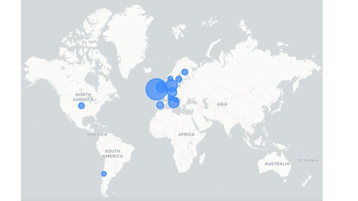Figure. 2. Heat map showing the geographic distribution of investigations about tail biting assessment in slaughtered pigs. It appears evident that almost all studies have been carried out in Western Europe.