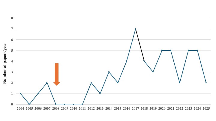 Figure. 3. Temporal distribution of investigations about tail biting assessment in slaughtered pigs. Most of papers have been published after 2008 (red arrow).