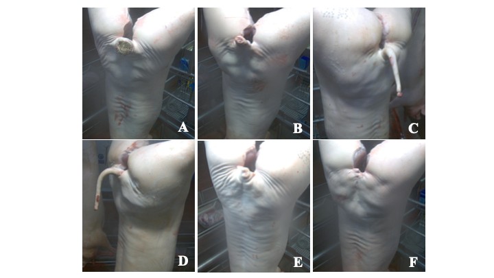Figure. 1. Tail-biting lesions in slaughtered pigs. Large necrotic–ulcerative lesions on the tip of the tail stump (A, B). An undocked tail missing its flat tip, which is scarred and deformed (C). Ulcerative lesion on the lateral surface of the tail (D). Healed partial (E) and complete (F) tail loss.