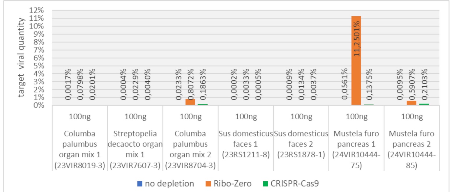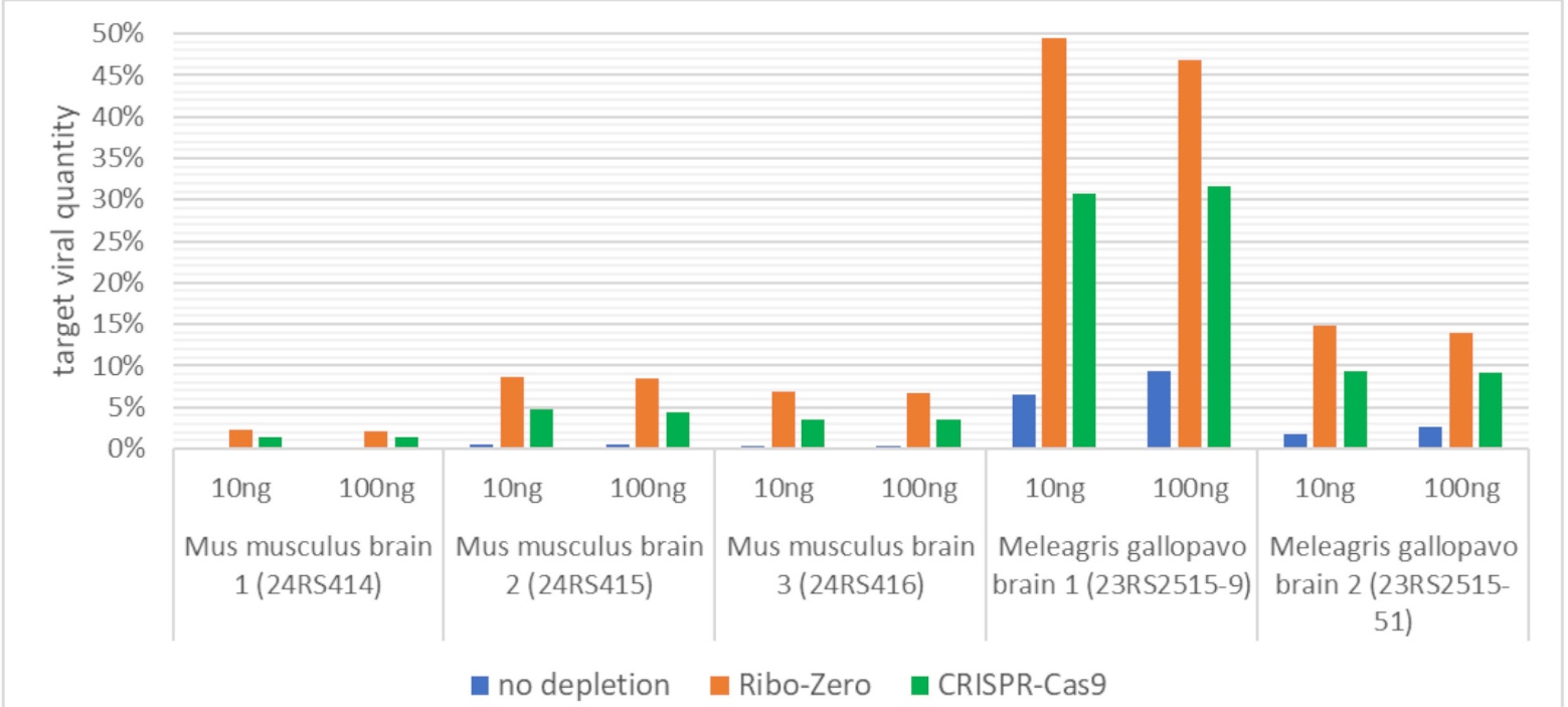 In conclusion, CRISPR-Cas9–based depletion shows promising potential for viral metagenomic sequencing, although it currently remains less efficient and more costly than enzymatic methods. To our knowledge, this is the first study to evaluate its performance in rRNA-rich tissues, extending previous work largely limited to low-rRNA respiratory human samples (Cerón et al., 2023; Chan et al., 2023; Gu et al., 2016). Improvements in efficiency and specificity for rRNA depletion in veterinary-relevant species, along with reduced cost and improved tolerance to degraded samples, could establish CRISPR-Cas9 as a powerful tool for untargeted surveillance of animal pathogens.