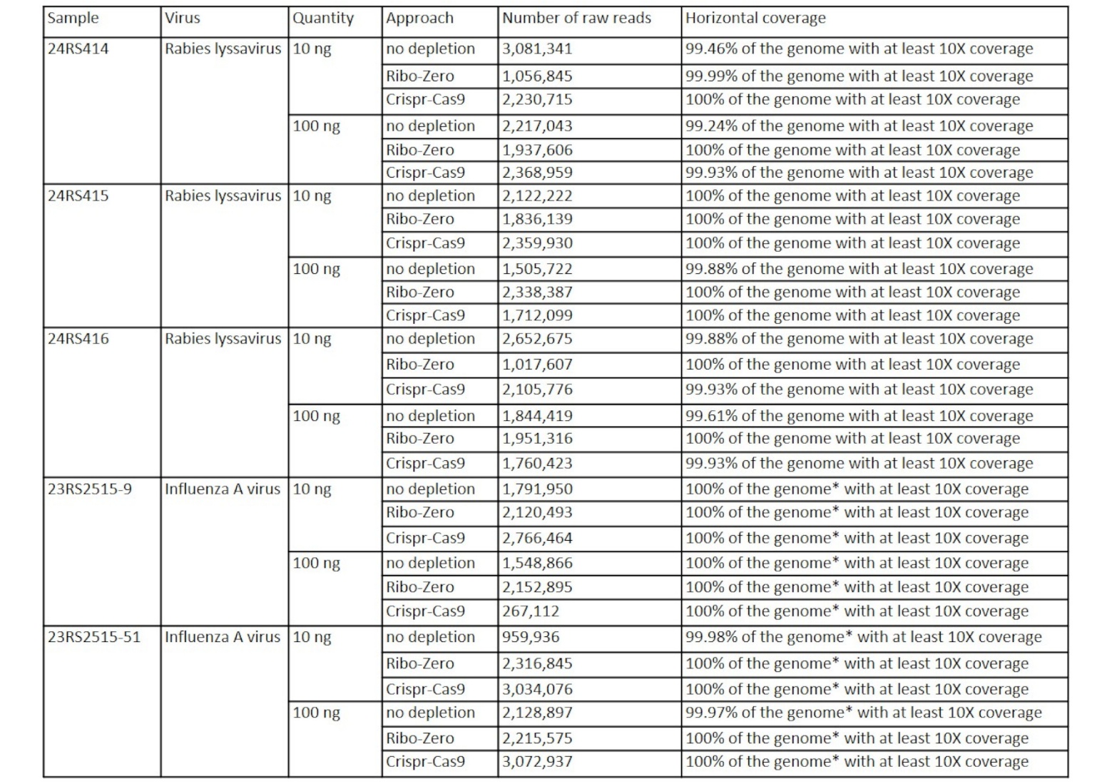 Table. II. Horizontal coverage of viral consensus sequences in Round I samples. *For segmented viruses, such as influenza A virus, the reported genome coverage represents the combined coverage across all genomic segments composing the viral genome.