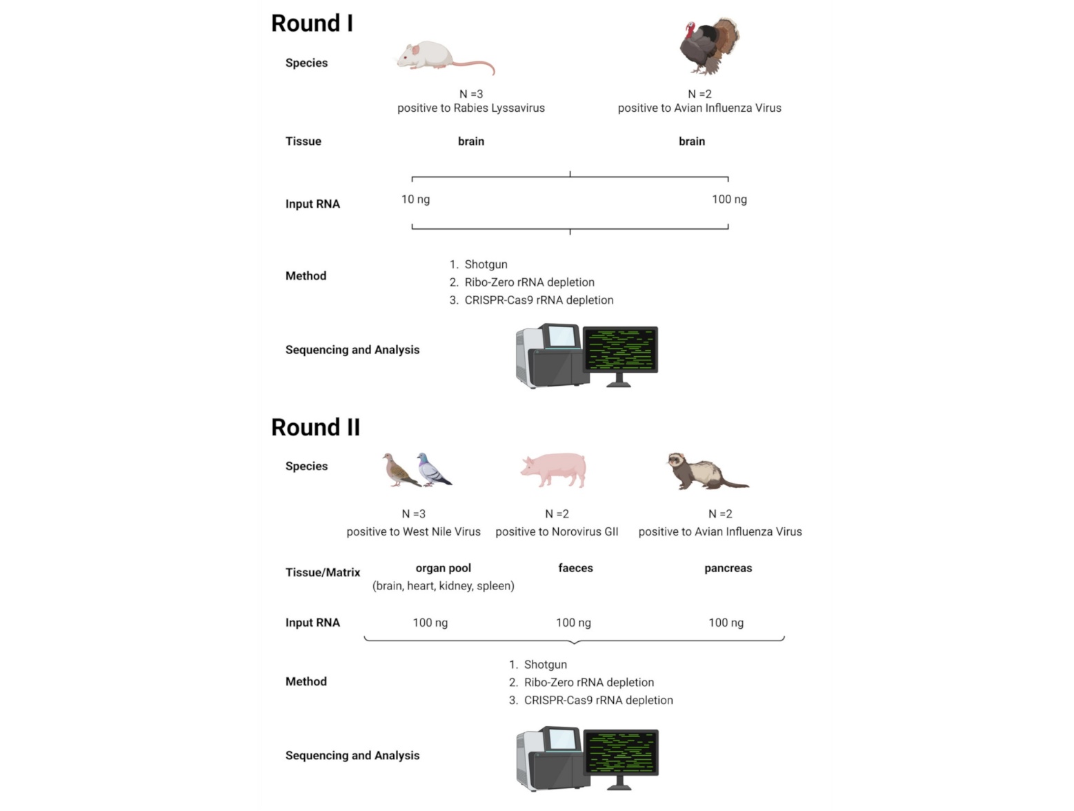 Figure. 1. Experimental design of the study. In Round I, brain tissues from mouse and turkey were chosen as the target and non-target species for the rRNA depletion kits, respectively. Round II extended the evaluation to additional mammalian and avian species and to lower-quality tissue types and sample matrices compared with Round I.